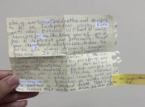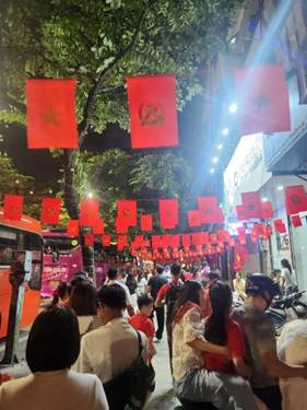 またベトナム人の国民性も印象的でした。ベトナム人はルールや規則がありながらもすごく自由に生きているなと感じます。体調が悪くなった時のために病院の下見に行った際、休日で本来建物の中には入れない日だったのですが、警備員の方に聞くとエントランスだけならいいよと中に入れてくれました。日本と比べて、良い意味できっちりしすぎていない柔軟さがあって、そこに心地よさを感じました。私は日本の規則をちゃんと守るという文化も素晴らしいと思うのですが、個人的にはベトナムの緩くて細かいことは気にしないという空気感も好きで、肩の力を抜いて過ごせる感じがあります。またベトナムでは、信号はあってないようなものでした。信号が青から赤に変わったタイミングでも、お構いなく車やバイクは走っていきます。歩道ですら前からも後ろからもバイクがすごいスピードで迫ってくるので、気を抜いて歩けません。交通事情も色んな意味で自由だと感じました。次に愛国心です。ちょうど私たちの滞在のタイミングがベトナムの独立記念日と重なり、普段とは違うハノイの雰囲気を味わうことができました。今年は独立80周年ということもあり、街中がお祭りムードでした。国旗が至る所に飾られ、パレードの予行練習がある日は、みんなベトナム国旗の入ったTシャツを着て夜から場所取りをしていました。当日パレードを見に行った友人は、人が多すぎてパレードは見れず、パレードを見ている人を見に行ったようなものだったと話しており、ベトナム人の愛国心が窺えました。最後に、私は滞在中、この国の人にとっての幸せとは何なのかが気になっていました。もちろん上から目線的な意味合いは一切なく、純粋な関心としてです。ベトナム人の中でも個人によって違う価値観を持っていると思いますが、AGSの方に聞いてみると、メモ用紙に小さな文字で隙間なく回答を書いて渡してくれました。そこには、誰からの支配も受けず、自立して自分達の意思で生きていけることが幸せだと書かれてありました。これらの言葉から、そう遠くない過去にこの地が植民地であったという背景を思い起こさせられ、ベトナム人は、自由というものに対して強い想いを持っているのかもしれないと感じました。そんな自由で愛国心溢れるベトナムの方と3週間関われて、楽しいことも、怖い思い(主に路上で)もしましたが、全てがとても貴重な経験だったと感じています。
